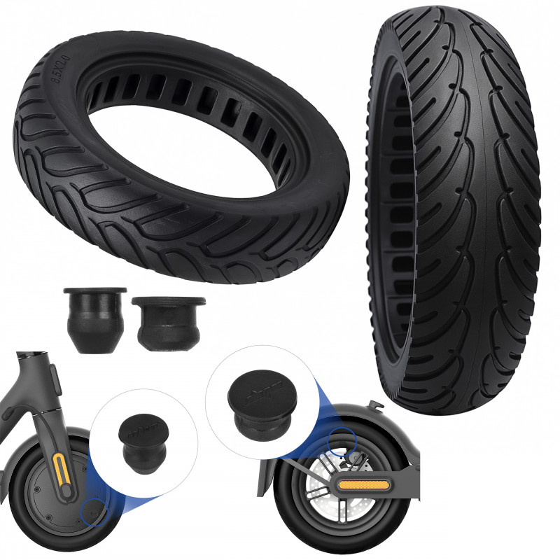 Prezentujemy kompletny zestaw 2 wysokiej jakości opon bezdętkowych o wymiarach 8,5 x 2,0 cala, idealnych jako zamienniki dla standardowych opon dętkowych. W komplecie znajdują się również 2 zaślepki do otworów na wentyle, które stosuje się podczas wymiany opon z dętkowych na bezdętkowe – dzięki nim otwory po wentylach zostają estetycznie zakryte i zabezpieczone.